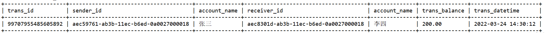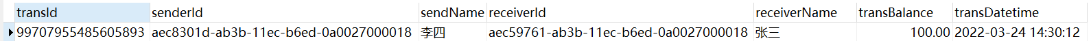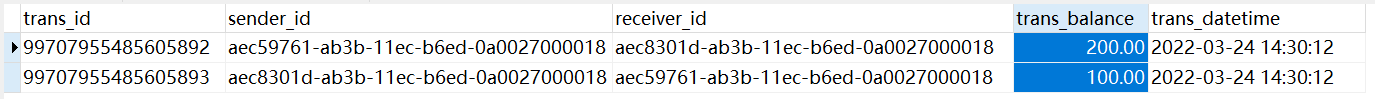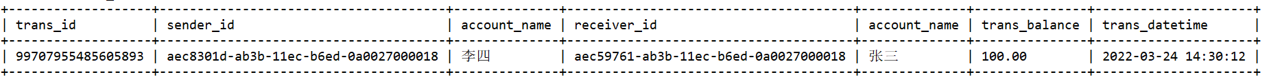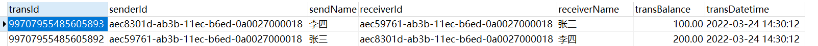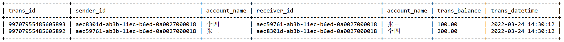 INSERT INTO transrecord(trans_id,sender_id,receiver_id,trans_balance,trans_datetime) VALUES( UUID_SHORT(), 'aec59761-ab3b-11ec-b6ed-0a0027000018', -- 张三 'aec8301d-ab3b-11ec-b6ed-0a0027000018', -- 李四 200, SYSDATE()); INSERT INTO transrecord(trans_id,sender_id,receiver_id,trans_balance,trans_datetime) VALUES( UUID_SHORT(), 'aec8301d-ab3b-11ec-b6ed-0a0027000018', -- 李四 'aec59761-ab3b-11ec-b6ed-0a0027000018', -- 张三 100, SYSDATE());