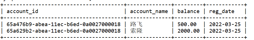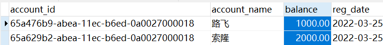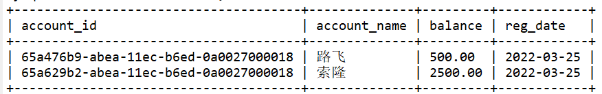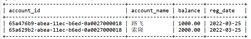 -- 创建账号表 create table account( account_id varchar(36) PRIMARY KEY, -- 使用UUID生成唯一值,UUID32+4 account_name varchar(15) NOT NULL, balance decimal(10,2) NOT NULL, -- 十进制 reg_date date NOT NULL ); -- 插入数据到账号表 INSERT INTO account(account_id,account_name,balance,reg_date) VALUES(UUID(),'路飞',1000,CURDATE()); INSERT INTO account(account_id,account_name,balance,reg_date) VALUES(UUID(),'索隆',2000,CURDATE());