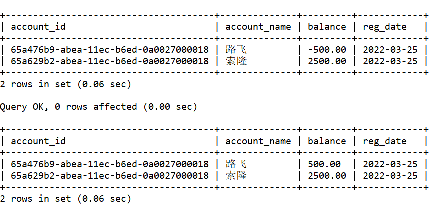 从结果可以看出,执行事务回滚后,账户数据恢复到初始状态,即该事务执行之前的状态。
