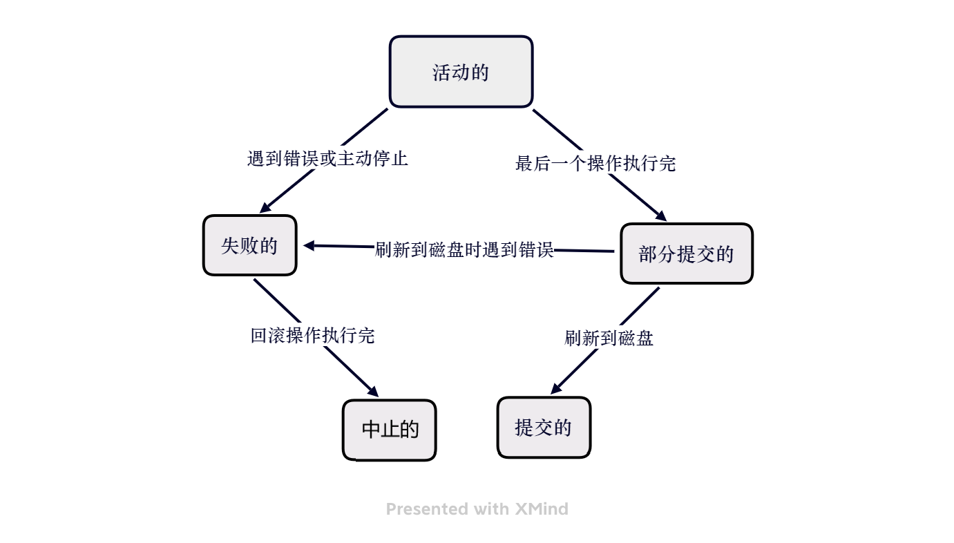 由此可见,只有当事务处于提交的或者中止的状态时,一个事务的生命周期才算结束。对于已经提交的事务来说,该事务对数据库所做的修改将永久生效,对于处于中止状态的事务,该事务对数据库所做的修改都会被回滚到没执行该事务之前的状态。