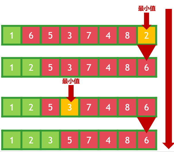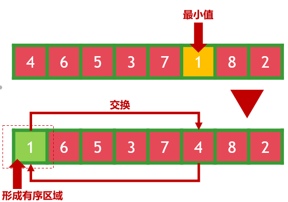 首先在无序部分中寻找最小元素所在的位置,然后将其与第一位的元素交换:
