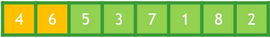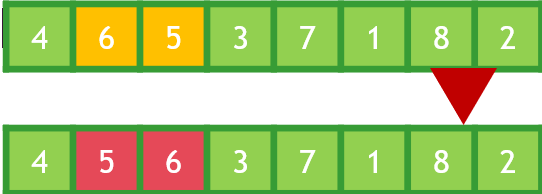第一轮的排序,首先比较前两个元素,如果顺序与升序相反则交换,否则什么也不做: