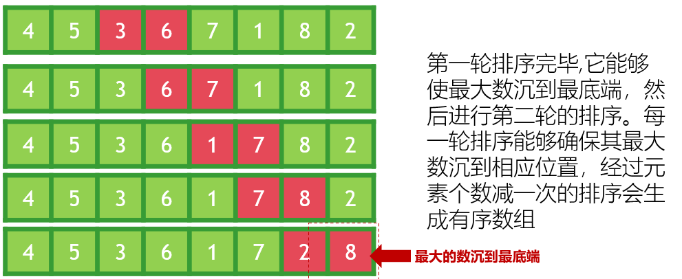 冒泡排序主要的思想是进行相邻的两个元素之间比较并且交换,有利于利用原有元素在集合中的位置优势,冒泡排序的原则是大的下沉小的上浮(跟最终的排序要求保持一致)