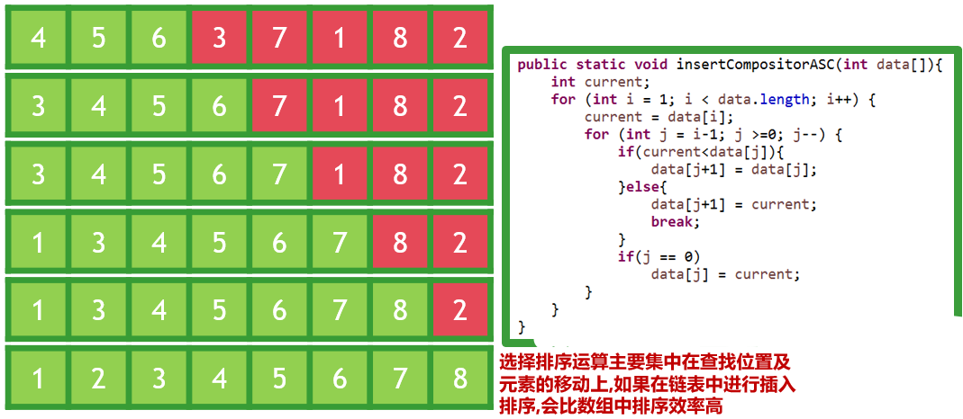 // 插入排序 private static void insertSort(int[] data) { int current; for (int i = 1; i < data.length; i++) { current = data[i]; for (int j = i - 1; j >= 0; j--) { if (current < data[j]) { data[j + 1] = data[j]; } else { data[j + 1] = current; break; } if (j == 0) { data[j] = current; } } } for (int i : data) { System.out.print(i + "\t"); } } -