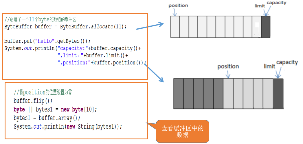 import java.nio.ByteBuffer; public class FileWriterWithNIO { public void writerWithNIO() { //创建了一个11个byte的数组的缓冲区 ByteBuffer buffer = ByteBuffer.allocate(11); System.out.println("==刚创建ByteBuffer对象=="); System.out.printf("capacity:%s,limit:%s,position:%s\n", buffer.capacity(), buffer.limit(), buffer.position()); System.out.println("==ByteBuffer对象写入数据=="); //buffer写入数据 buffer.put("hello".getBytes()); System.out.printf("capacity:%s,limit:%s,position:%s\n", buffer.capacity(), buffer.limit(), buffer.position()); System.out.println("==调用buffer.flip()=="); //position归0,limit的值就position原来的值 buffer.flip(); System.out.printf("capacity:%s,limit:%s,position:%s\n", buffer.capacity(), buffer.limit(), buffer.position()); byte[] array = buffer.array(); String s = new String(array, 0, buffer.limit()); System.out.println(s); } public static void main(String[] args) { new FileWriterWithNIO().writerWithNIO(); } } /* ==刚创建ByteBuffer对象== capacity:11,limit:11,position:0 ==ByteBuffer对象写入数据== capacity:11,limit:11,position:5 ==调用buffer.flip()== capacity:11,limit:5,position:0 hello */