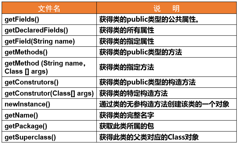 Class类是Java反射机制的基础,通过Class类,可以得到一个类的基本信息。以下类是Class类的常用方法: