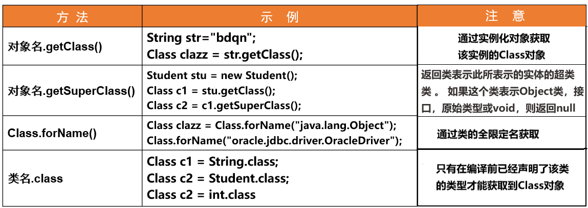 public class Person { String name; Integer age; public Person() {} public Person(String name) {this.name = name;} public Person(String name, Integer age) { super(); this.name = name; this.age = age; } public String getName() {return name;} public void setName(String name) {this.name = name;} public Integer getAge() {return age;} public void setAge(Integer age) {this.age = age;} @Override public String toString() { return "Person{" + "name='" + name + '\'' + ", age=" + age + '}'; } }import java.util.HashMap; //反射案例 public class ReflectTest { public static void main(String[] args) throws Exception { String str = "Yi"; Class c11 = str.getClass(); /*class java.lang.String*/ System.out.println(c11); Person p = new Person("Yi", 21); // 方式一:通过对象名.getClass()获取Class类 Class c1 = p.getClass(); System.out.println(c1);/*class com.tjetc.reflect.Person*/ Person p1 = new Person(); Class c2 = p1.getClass(); System.out.println(c2);/*class com.tjetc.reflect.Person*/ // 方式二:通过对象名.getSuperClass()方法获得Class类----获取父类的Class对象 Class c22 = c2.getSuperclass(); System.out.println(c22);/*class java.lang.Object*/ try { // 方式三:通过Class.forName("") 获取Class对象 Class c33 = Class.forName("java.lang.String"); System.out.println(c33); Class c3 = Class.forName("com.tjetc.reflect.Person"); System.out.println(c3); } catch (ClassNotFoundException e) { e.printStackTrace(); } // 方式四:通过类名.class来获取Class对象 Class c44 = String.class; Class c444 = Person.class; Class c4 = int.class; Class c4444 = HashMap.class; System.out.println(c44);/*class java.lang.String*/ System.out.println(c444);/*class com.tjetc.reflect.Person*/ System.out.println(c4);/*int*/ System.out.println(c4444);/*class java.util.HashMap*/ } } -