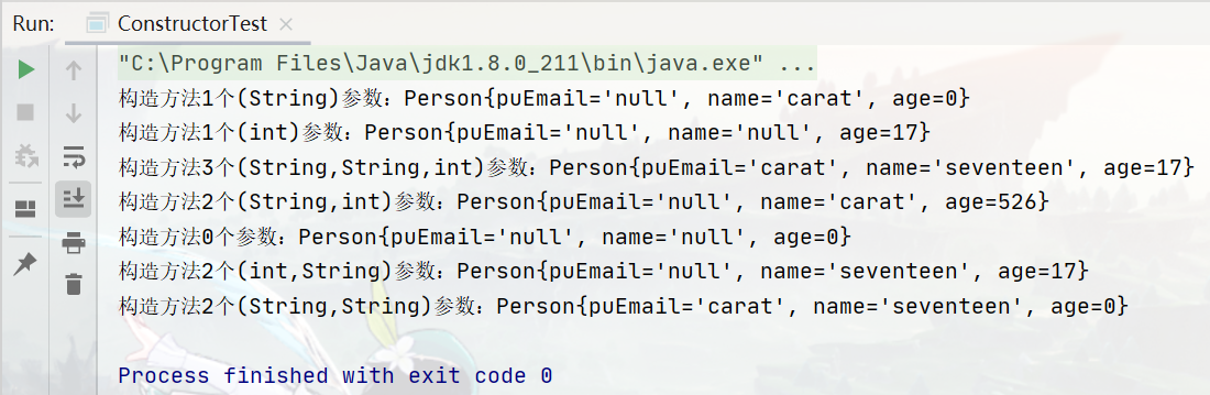 - e(Constructor 调用 newInstance(Object… paramValues) 时传入构造方法参数的值,同样可以构造一个实例,且内部属性已经被赋值。