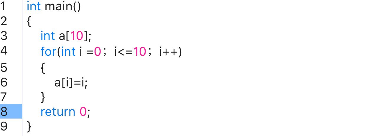 数组内有10个元素,for循环赋值了11次,导致内存溢出。