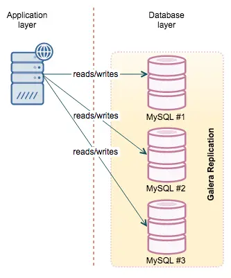 应用可以在 Galera Cluster 的任何一个节点上写入数据。其基于证书认证的 Replication 会把提交的事务应用到所有节点上。基于证书认证的 Replication 是使用组通信和事务排序技术来进行同步数据库 Replication 的一种方法。