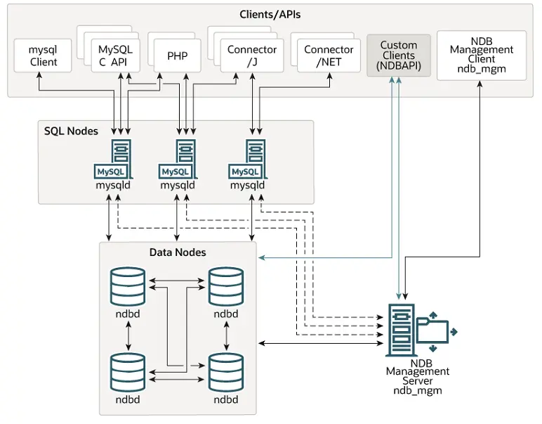 最后的(也是最终的)一个方案是使用一种同步模式的集群,它就是 MySQL Cluster(也称为MySQL NDB Cluster)。MySQL Cluster 与我们平时使用的MySQL存储引擎 InnoDB 不同,它基于 NDB 存储引擎,该存储引擎专门为 Cluster 而设计,它主要将数据存储在内存中,并且独立于MySQL server 实例。NDB 代表“网络数据库”。如下为官方的 Cluster 组件示例图: