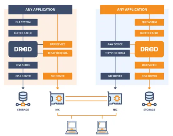 上图是DRBD的工作栈模型,可以看到DRBD需要运行在各个节点上,且运行在节点主机的内核中(Linx2.6.33版本起DRBD已整合进内核模块)。