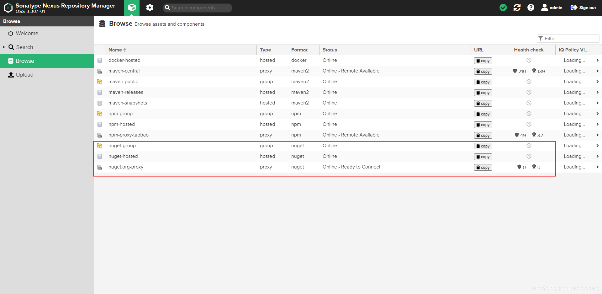 先做好 Nexus 的配置,创建 nuget 仓库,默认情况下, Nexus 已经预装好了 nuget 的仓库