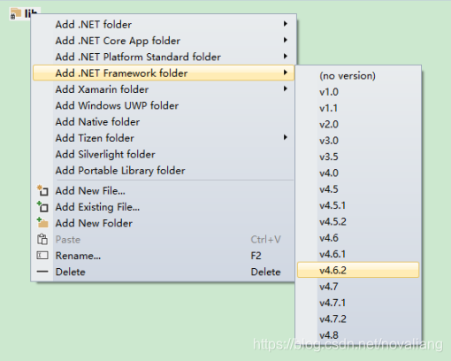 如果你的库只是一个单独的库,并且你在你自己的项目里并不关心框架的版本的话,那么选择 "Add Existing File..."就可以了,但是如果你有特殊需求,例如你的库可能面向不同的框架,那么你就需要选择 "Add Lib Folder" ,然后在创建的 lib 文件夹上右键,选择你当前需要打包的库所支持的框架版本,我建议这样做,因为这是更标准的做法,看下图所示: