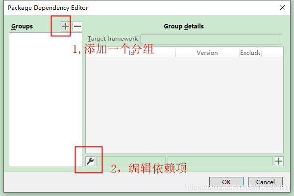 我之前随便创建的一个库,是.NET FRAMEWORK 4.6.2 的环境,所以我按上图选择了,选好后,在创建的文件夹上右键,导入你需要打包的库文件,然后编辑包的元信息,Id、版本、作者等等。注意在编辑包的元信息下面,还可以指定一些依赖项,例如你的包如果依赖了n,那么你可以点击"Edit dependencies"来添加这些依赖。这些依赖不会随你的包打包,而是在别人引入你的包的时候下载的: