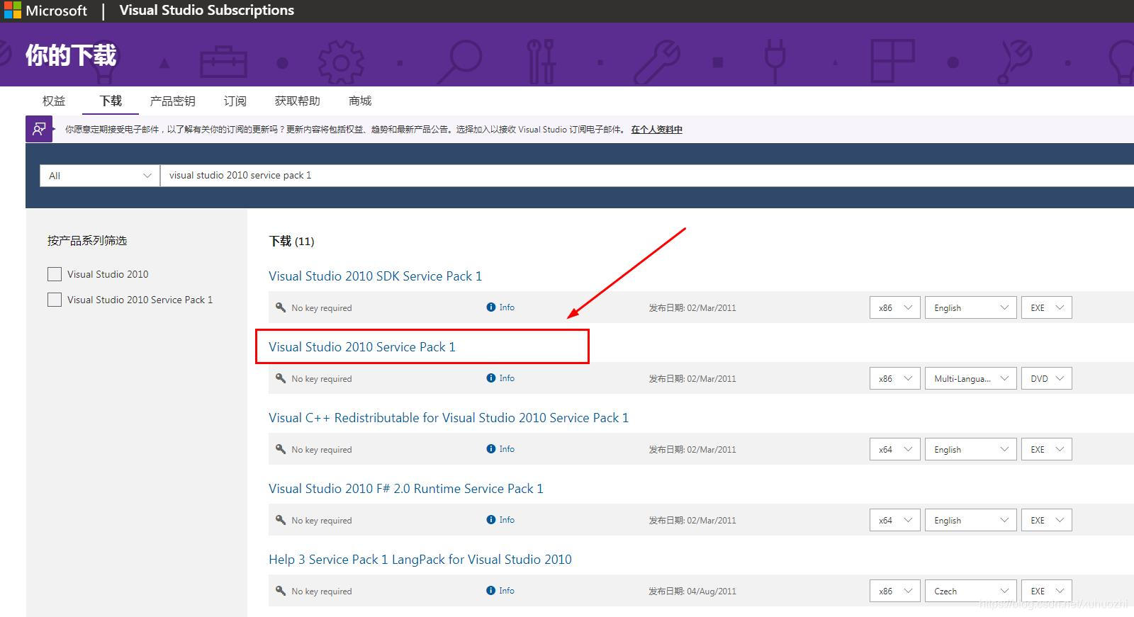 官网下载链接: https://my.visualstudio.com/Downloads?q=visual%20studio%202010%20service%20pack%201