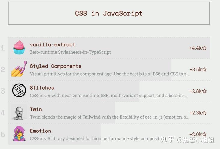 排名前五分别是 vanilla-extract,Styled,Components,Stitches,Twin,Emotion。