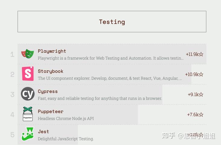排名前五分别是 Playwright,Storybook,Cypress,Puppeteer,Jest。