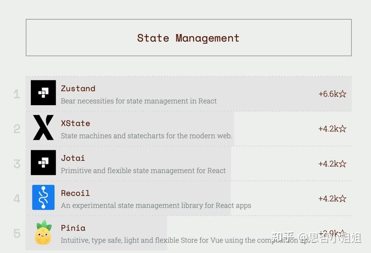 排名前五分别是 Zustand,XState,Jotai,Recoil,Pinia。