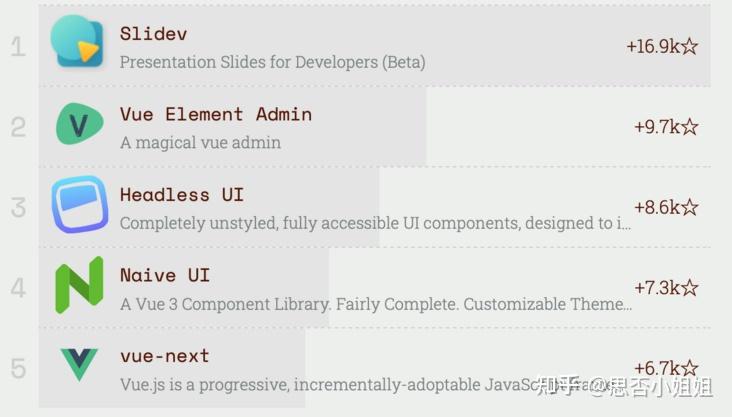 在 Vue 生态圈“一项里,排名前五的分别是:Slidev,Vue Element Admin,