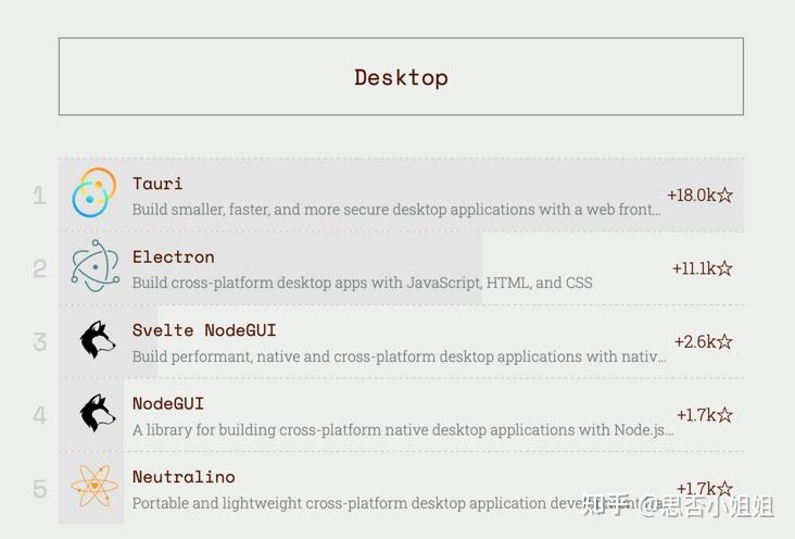 排名前五分别是 Tauri,Electron,Svelte NodeGUI,NodeGUI