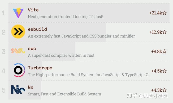 在“构建工具”一项里,排名前五的分别为:Vite,esbuild,swc,Turborepo,Nx。