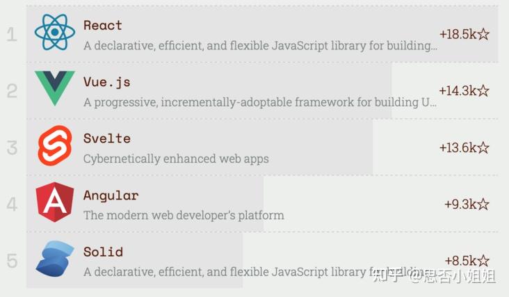 此次报告结果中,“前端框架”一栏里的排名前五分别是:React,Vue.js,Svelte,Angular,Solid。