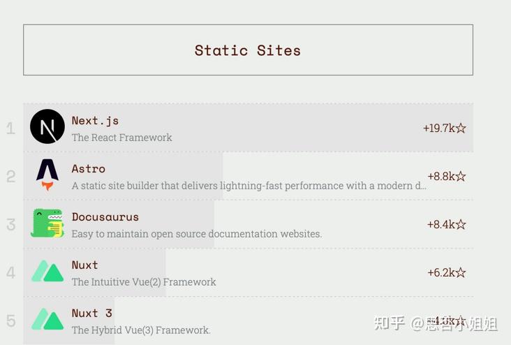 排名前五分别是 Next.js,Astro,Docusaurus,Nuxt,Nuxt 3。