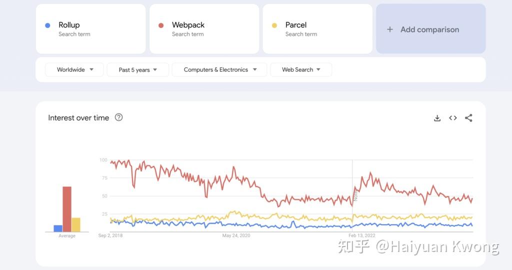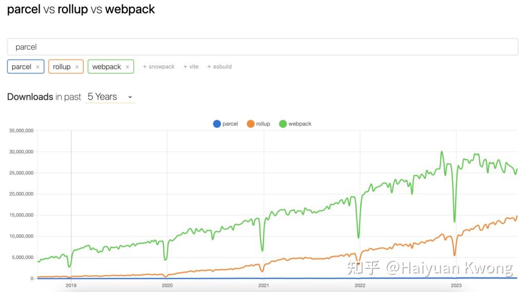 衡量开发者社区对不同构建工具的偏好的一种有见地的方法是查看流行度指标。我们使用 NpmTrends 网站对 Rollup、Webpack 和 Parcel 进行了比较。