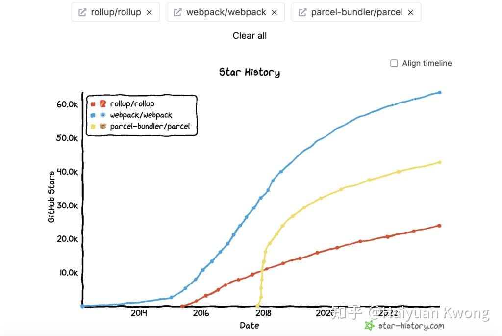 根据 npm 软件包的下载量,上图描绘了这些工具的受欢迎程度。让我们使用 star-history.com 网站来看看 Github 星级之间的比较: