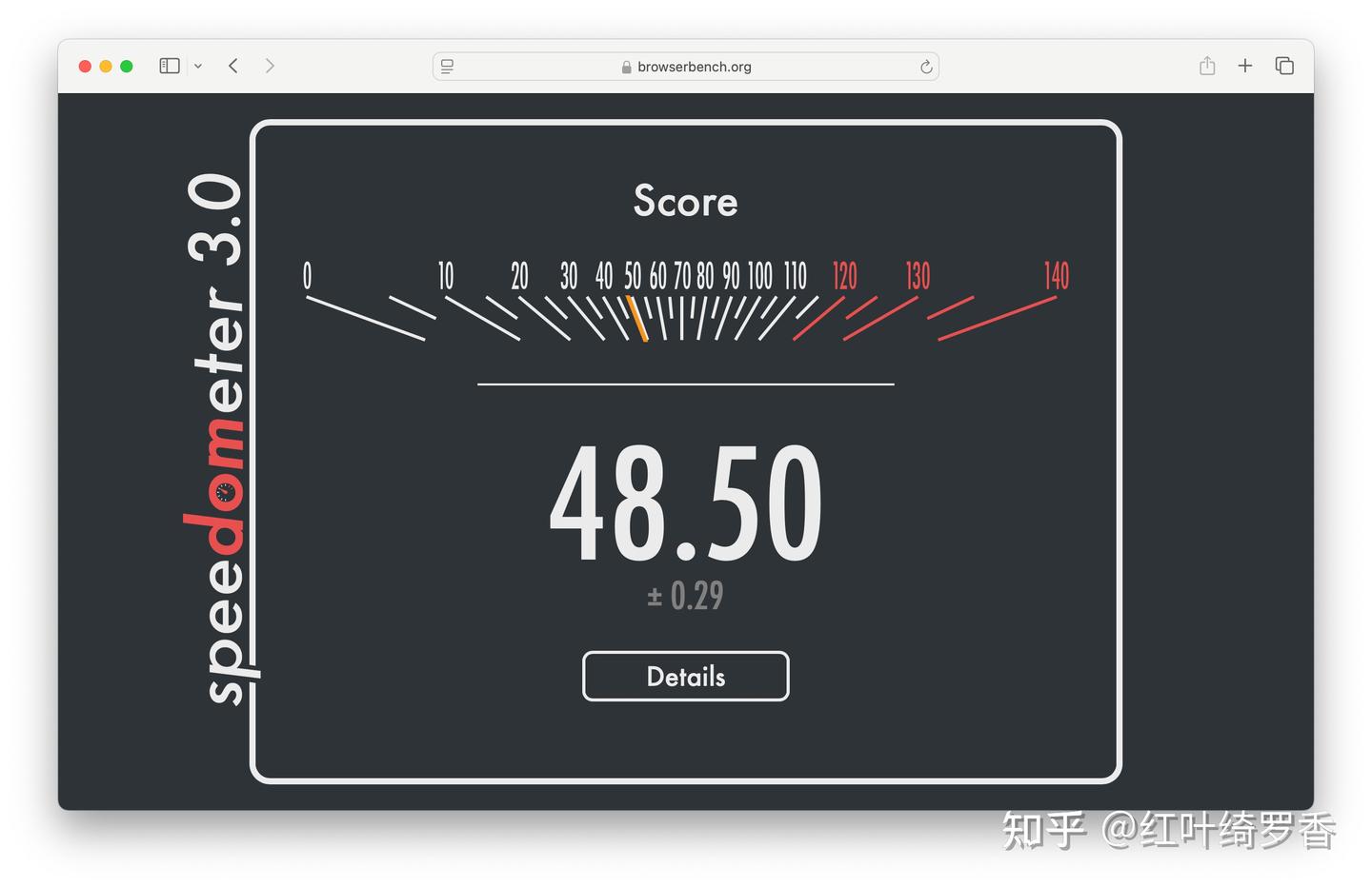 这里借助Speedometer3.0综合评估一下浏览器的性能水平,比如在M4芯片上,Safari浏览器大概可以跑出48.5分的成绩。