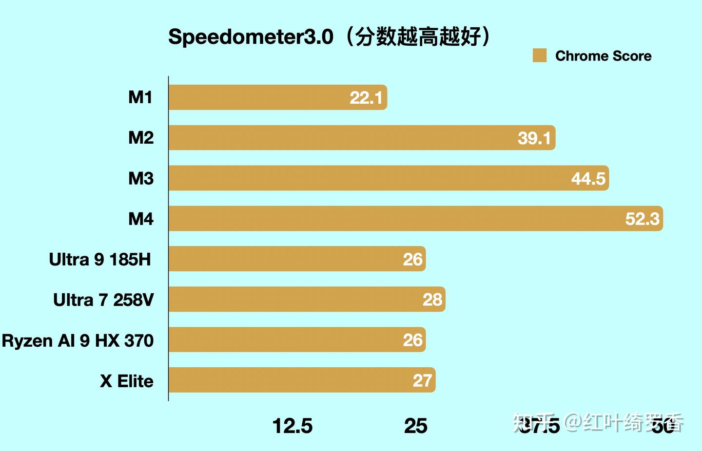 综合看一下几颗M系列芯片的性能,M4相较于M1基本性能翻倍了,这基本也对应了M4相较于M1单核性能翻倍。多说一句,这玩意主要依赖CPU单核性能,这也就意味着M系列芯片中Pro和Max级别的芯片,这部分性能也是和入门款芯片基本一样的。唯一例外的,其实是M2 Max和M2 Ultra,单核心主频要比M2和M2 Pro高了0.2GHz,Speedometer3.0的分数会略高一点点。