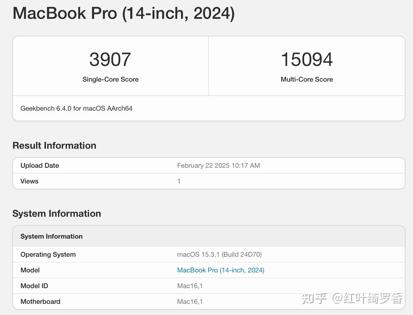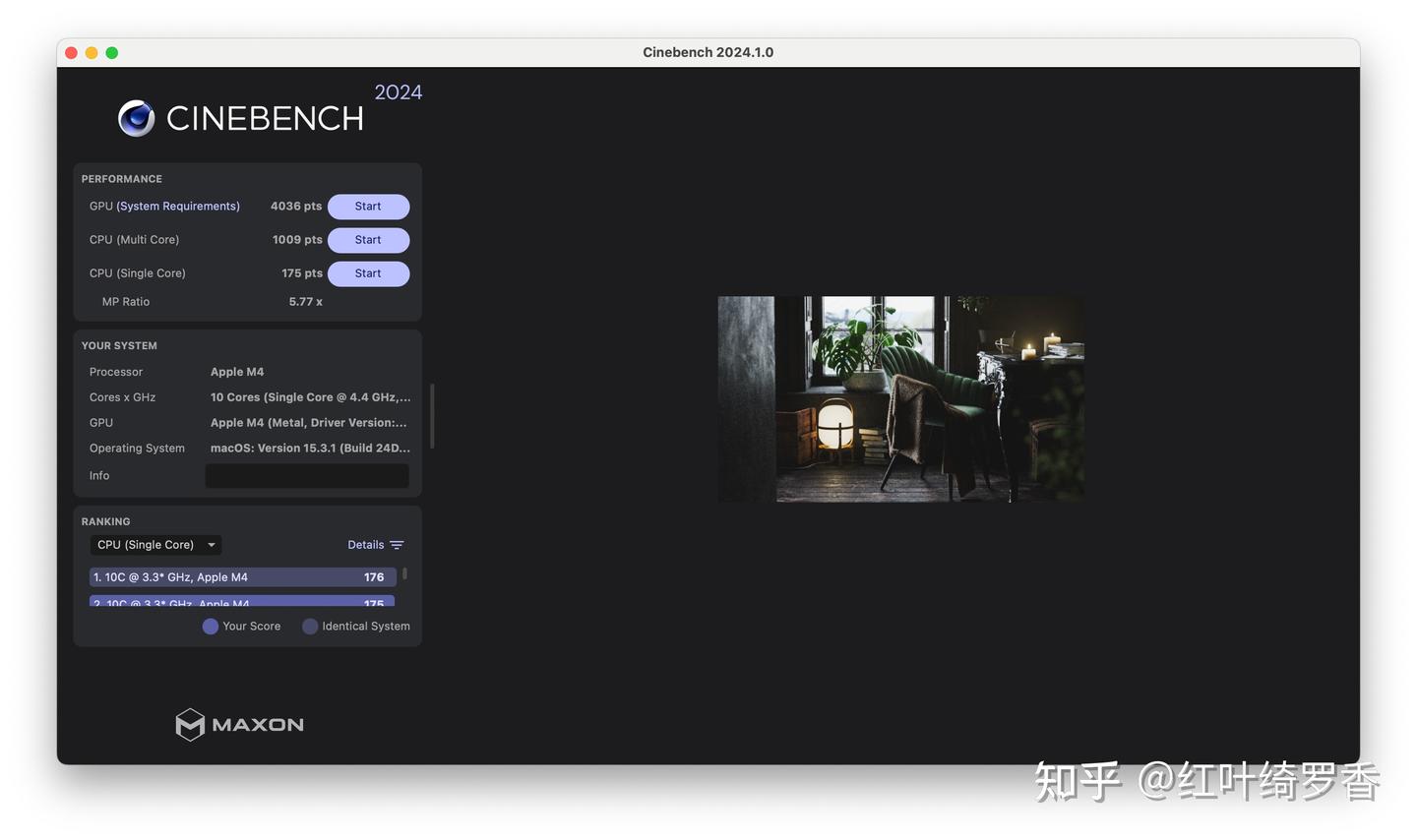 Cinebench可以分别跑CPU单核、多核渲染,也可以单独跑GPU渲染,我们这里主要关注GPU渲染成绩。以下是10核心的M4芯片的成绩。