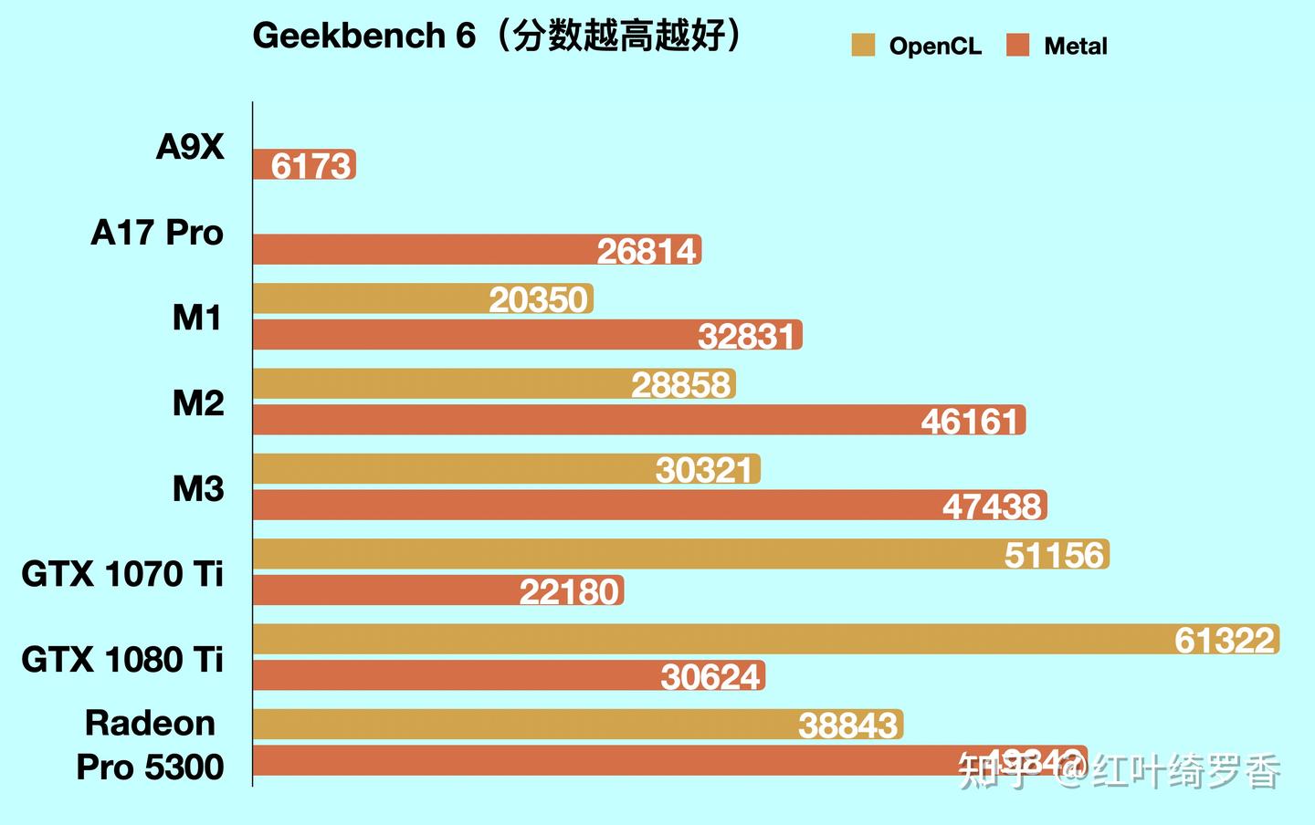 首先看看Geekbench 6测试,主要测试苹果的Metal和跨平台的OpenCL。