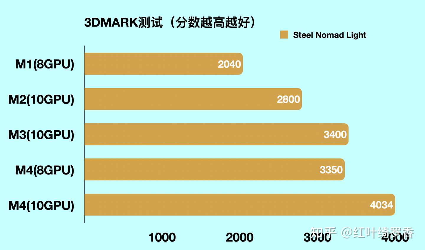 很明显,从M1到M4,GPU性能就是一直在稳步提升,而M4相较于M1而言,性能已经近乎翻倍了。