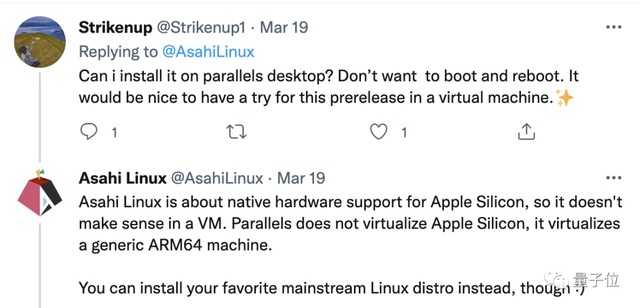 Asahi官方对此回复,Asahi Linux是为苹果硬件量身打造的,而Parallels Desktop虚拟的是一个通用ARM架构,适合安装其他Linux发行版。