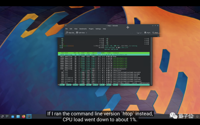 博主发现,只要打开图形性能监视器,CPU的负载会增加25%左右;但如果执行Asahi Linux给出的命令行’htop’,CPU的的负载将会直线下降到1%。