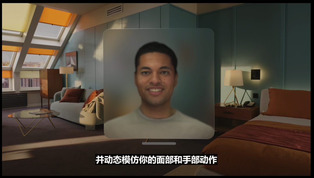 解决视频时使用者形象问题的方案,是提前做好一个 3D 面孔,叫做 Persona 功能。Vision Pro 上的 FaceTime 可以在视频通话时显示真人大小的人物,提前录入使用者的 3D 面孔数据,生产出一个 3D 建模渲染的自己。