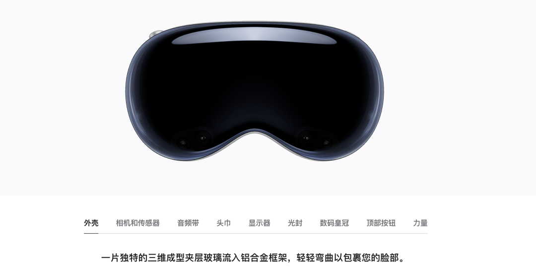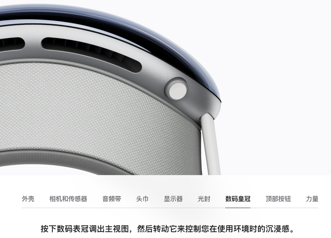 顶部设有旋钮「数字表冠(Digital Crown)」,供用户控制在 VR 或 AR 中的深度,类似于使用 AirPods Max 上表冠控制音量。