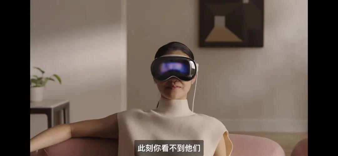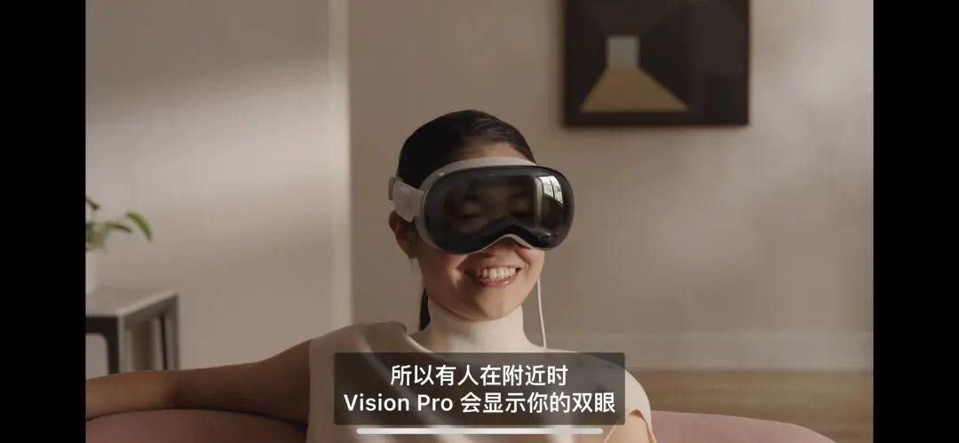 此外,为了不使用户和周围的人隔绝,苹果还开发了一个名为 Eyesight 的功能,这也是 Vision Pro 的另一个基础交互设计。当有人在附近时,Vision Pro 的黑色外壳可以变得透明,让周围的人看到用户的眼睛,并让周围的人意识到用户正在关注什么事情。