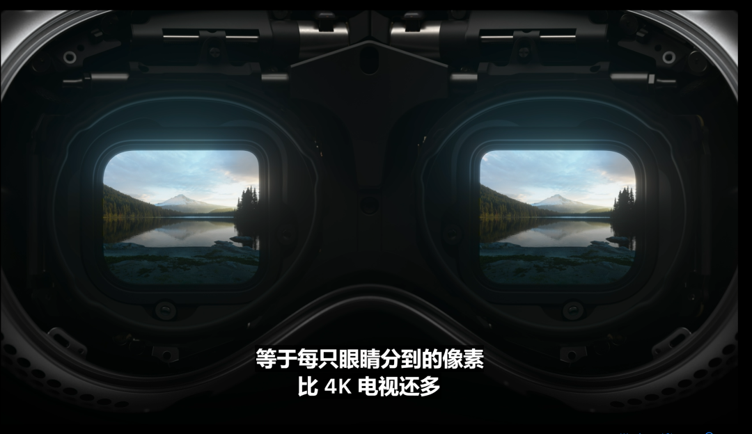 显示方面,苹果称其显示屏将前所未有地清晰。Vision Pro 配备了 12 颗摄像头,配备 Micro OLED 屏幕,拥有 2300 万像素,每只眼睛分配到的像素超越 4K 电视,可以实现 100 英寸屏幕的观看,支持 3D 视频观看,具有影院级视频观看体验。