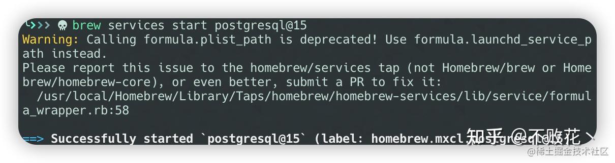 我们可以输入 brew services start postgresql@15 启动本地的 PostgreSQL 服务。