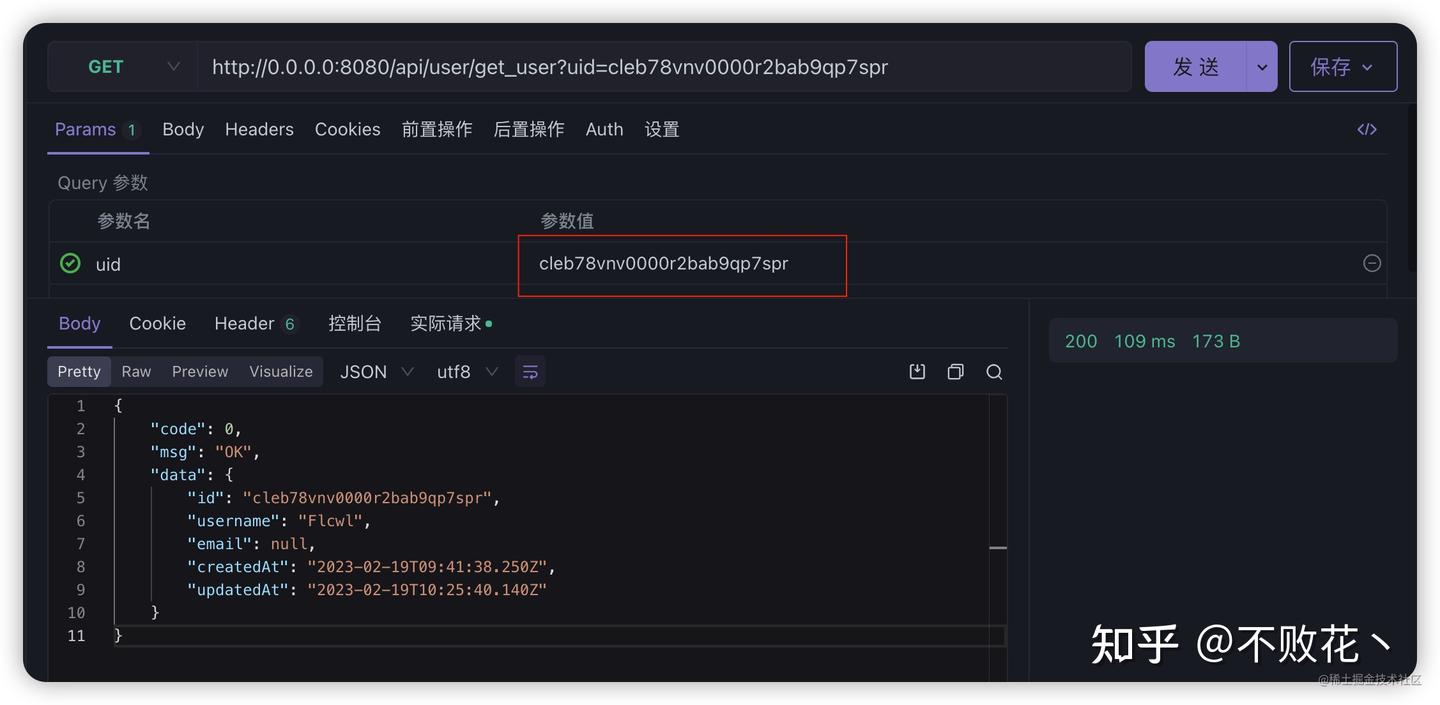 服务启动成功后,我们简单模拟一下请求发送:请求入参为 uid。
