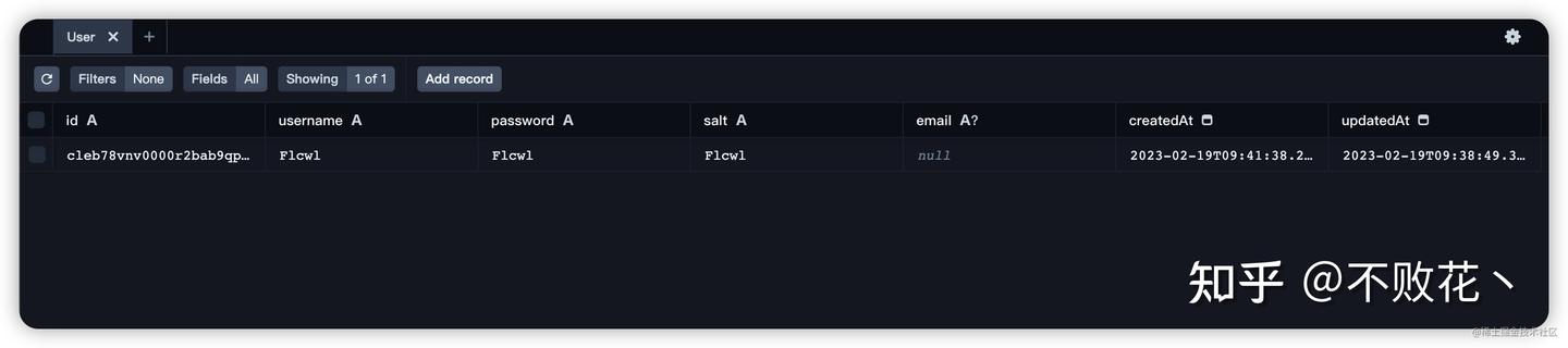 此时,表中已经出现了一条数据(record),说明我们数据库写入数据成功了。
