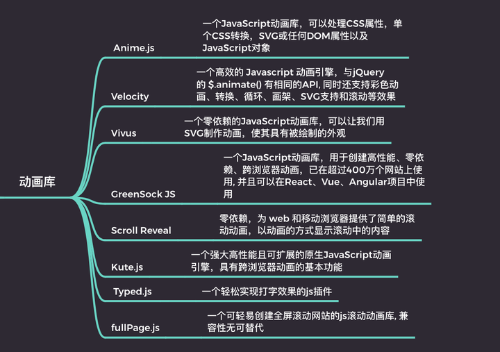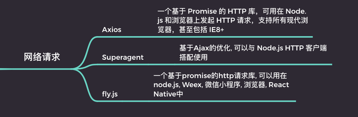 Axios 一个基于 Promise 的 HTTP 库,可用在 Node.js 和浏览器上发起 HTTP 请求,支持所有现代浏览器,甚至包括 IE8+Superagent 基于Ajax的优化, 可以与 Node.js HTTP 客户端搭配使用fly.js 一个基于promise的http请求库, 可以用在node.js, Weex, 微信小程序, 浏览器, React Native中动画库