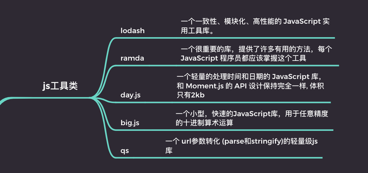 lodash 一个一致性、模块化、高性能的 JavaScript 实用工具库。ramda 一个很重要的库,提供了许多有用的方法,每个 JavaScript 程序员都应该掌握这个工具day.js 一个轻量的处理时间和日期的 JavaScript 库,和 Moment.js 的 API 设计保持完全一样, 体积只有2kbbig.js 一个小型,快速的JavaScript库,用于任意精度的十进制算术运算qs 一个 url参数转化 (parse和stringify)的轻量级js库decimal.js 实现JavaScript的任意精度的十进制类型库dom库