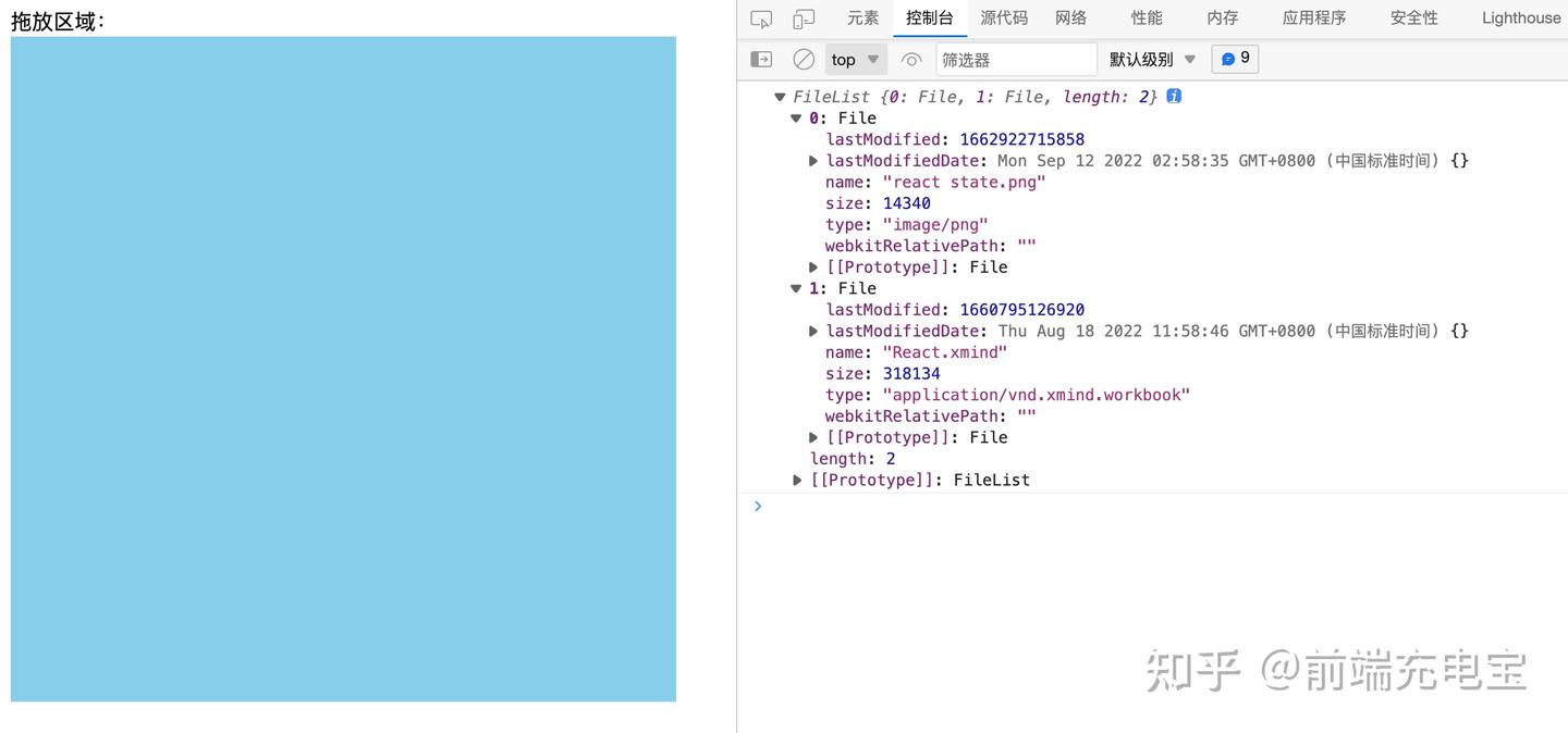 当拖放文件到拖放区域时,控制台就会输出一个 FileList 数组,该数组的每一个元素都是一个 File 对象。这个 FileList 数组是从事件参数的 dataTransfer 属性的 files 获取的: