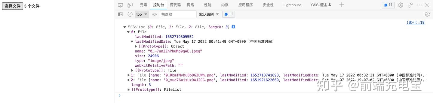 当点击上传文件时,控制台就会输出一个 FileList 数组,这个数组的每个元素都是一个 File 对象,一个上传的文件就对应一个 File 对象: