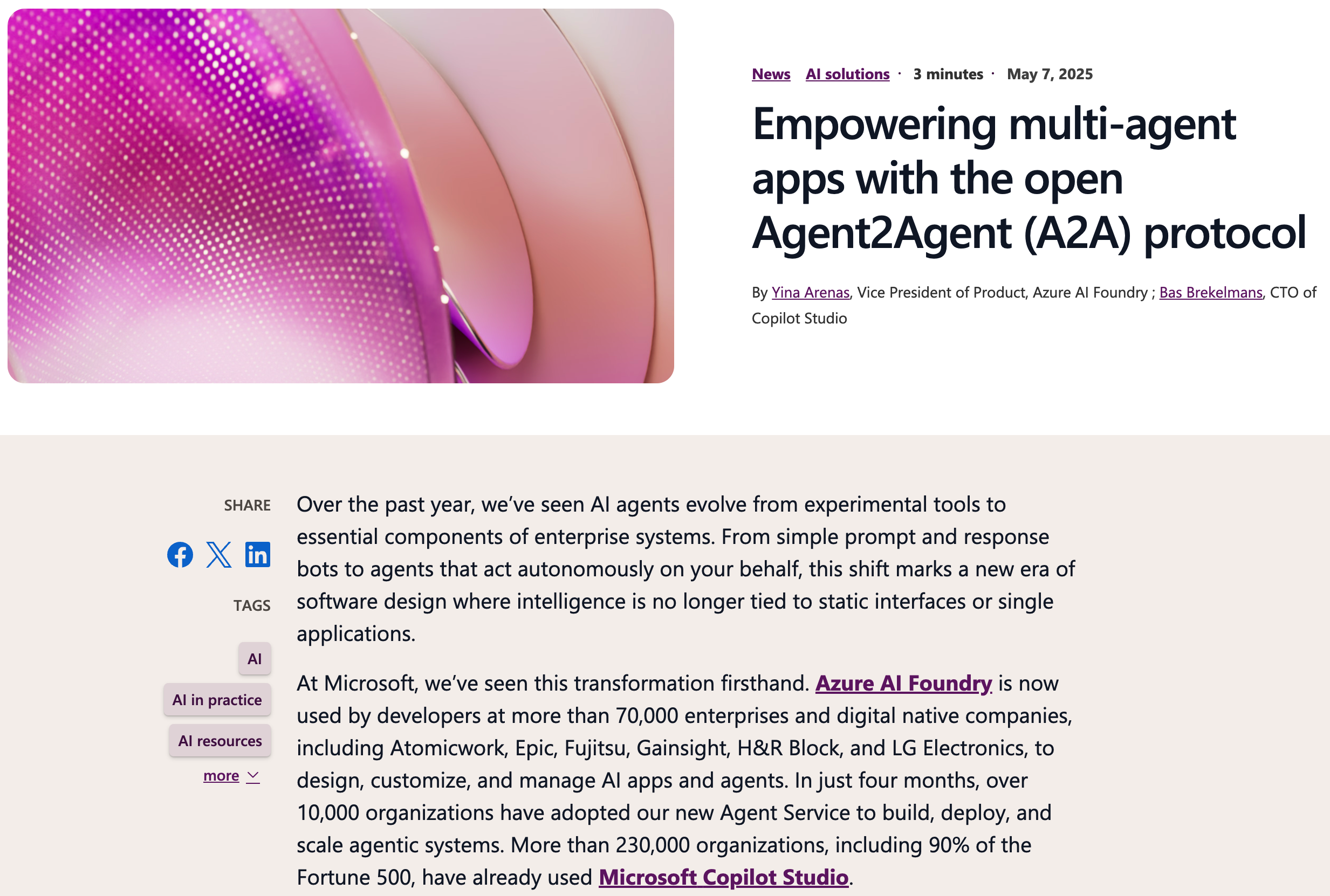 微软宣布,旗下 Azure AI Foundry 和 Microsoft Copilot Studio 两大开发平台已支持最新的 Agent 开发协议 A2A,并且还加入了 GitHub 上的 A2A 工作组,为协议和工具做出贡献。