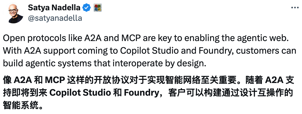 微软 CEO Satya Nadella 对此给出了高度评价,表示像 A2A 和 MCP 这样的开放协议是实现智能体网络的关键。随着 Copilot Studio 和 Azure AI Foundry 开始支持 A2A,客户将能够构建从设计上就具备互操作性的智能体系统。